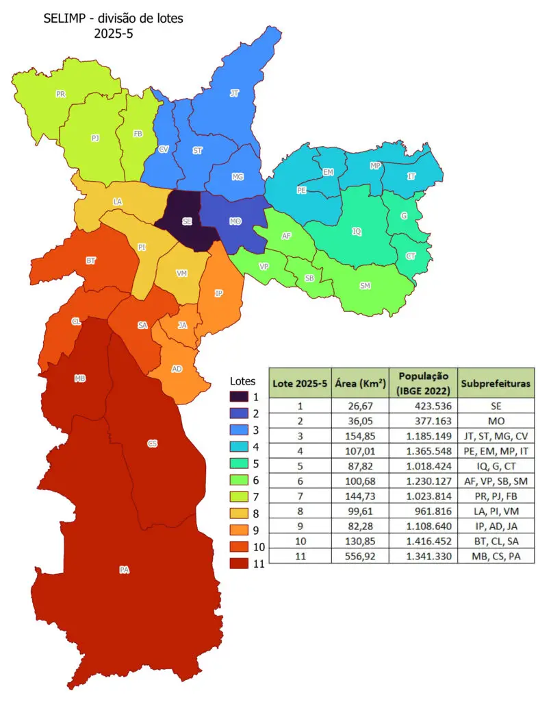 Mapa completo da divisão da cidade de São Paulo e respectivas empresas prestadoras do serviço para a Prefeitura por meio da Secretaria Executiva de Limpeza Urbana (Selimp). Lote 10: Constroeste – Butantã, Santo Amaro, Campo Limpo